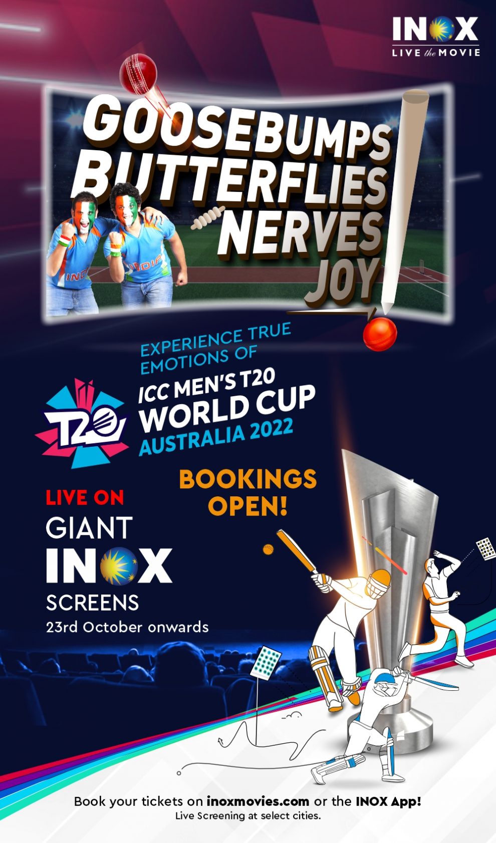 भारत की अग्रणी मल्टीप्लेक्स चेन आईनॉक्स लेजर लिमिटेड ने आज यह घोषणा की है कि आगामी आईसीसी टी20 वर्ल्ड कप 2022 के दौरान वह सभी क्रिकेट प्रेमियों को एक अद्भुत स्टेडियम जैसा अनुभव प्रदान करने जा रहा है, देशभर के अपने मल्टीप्लेक्स के स्क्रीन पर मैच का प्रसारण करके। 8वें आईसीसी मेंस T20 वर्ल्ड कप की शुरुआत 16 अक्टूबर को होने वाली है जिसमें से सुपर 12 चरण 22 अक्टूबर को शुरू होगा और इसका फाइनल 13 नवंबर को मेलबर्न में खेला जाएगा।