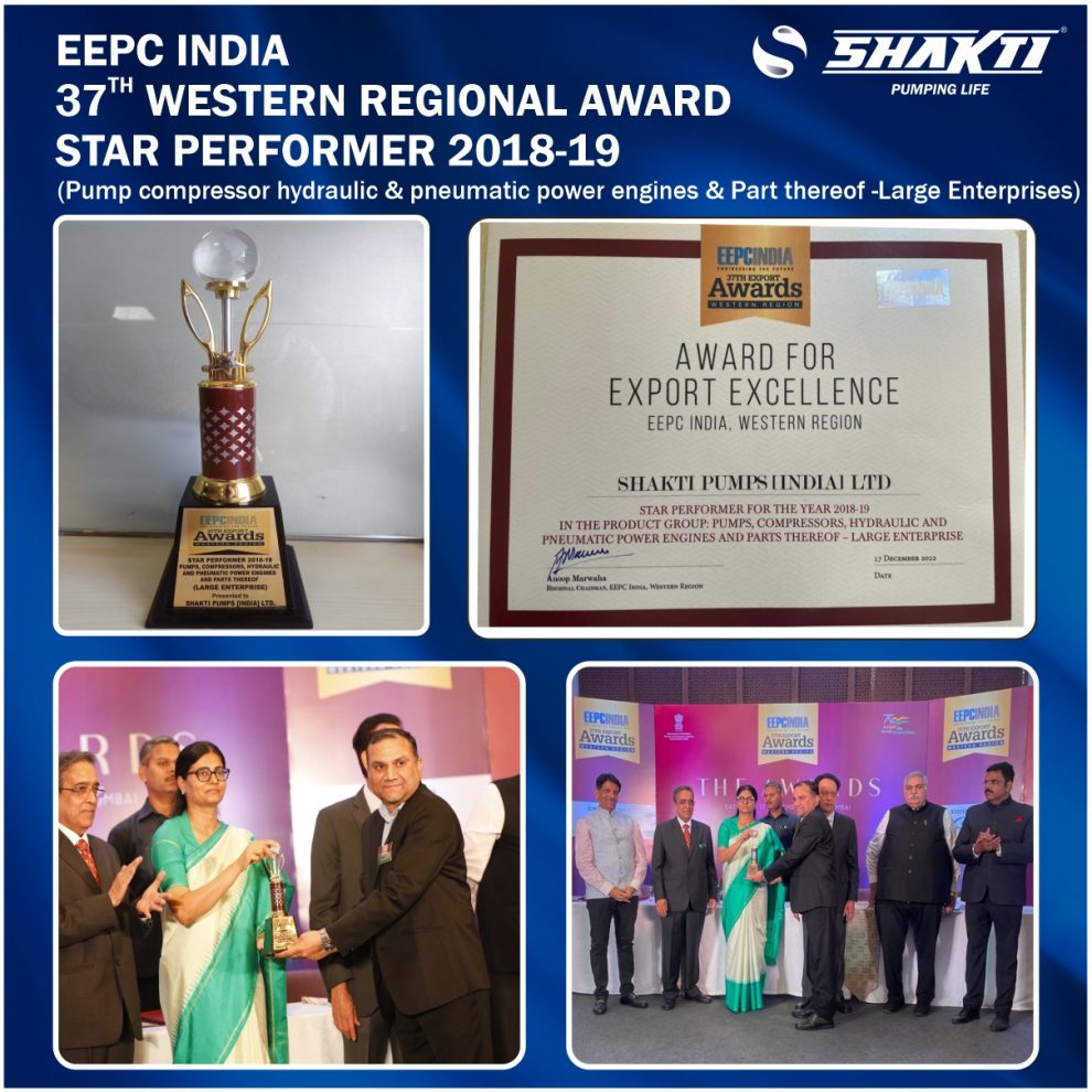 इंजीनियरिंग एक्सपोर्ट प्रमोशन काउंसिल इंडिया (ईईपीसी इंडिया) द्वारा ख्यात और तेजी से स्थापित हुई इंडस्ट्री शक्ति पंप्स को एक्सीलेंस इंजीनियरिंग एक्सपोर्ट अवार्ड से सम्मानित किया गया है। भारत सरकार के कामर्स एंड इंडस्ट्री मंत्रालय के अंतर्गत कार्यरत ईईपीसी इंडिया ने यह अवार्ड अपने 37वां वेस्टर्न रीजन अवार्ड समारोह में मुंबई के होटल फोर सीजन में प्रदान किया।